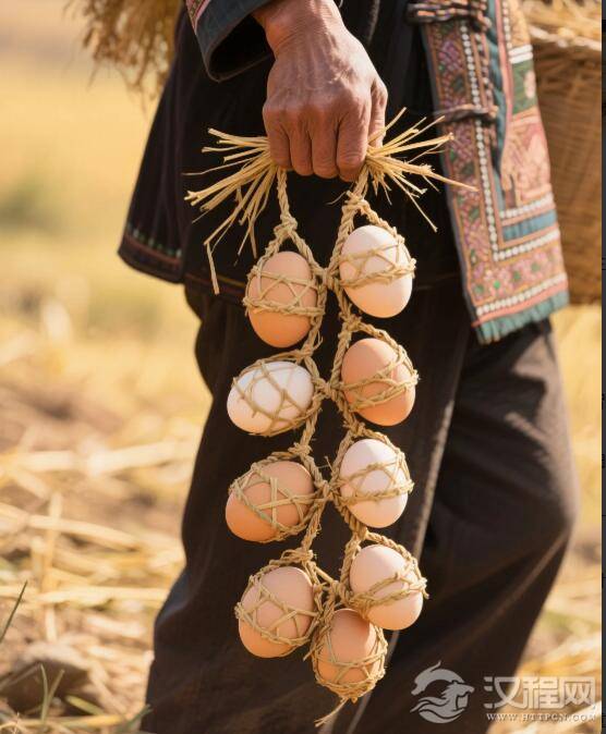 鸡蛋,难道不是该躺在精美的蛋托里,或装在塑料袋中吗?这用草绳串起来,像冰糖葫芦,又像超大号的项链,难道真是怕这些“圆滚滚”在云南的十万大山里独自“逛街”,一不小心就滚落山崖、迷了路?